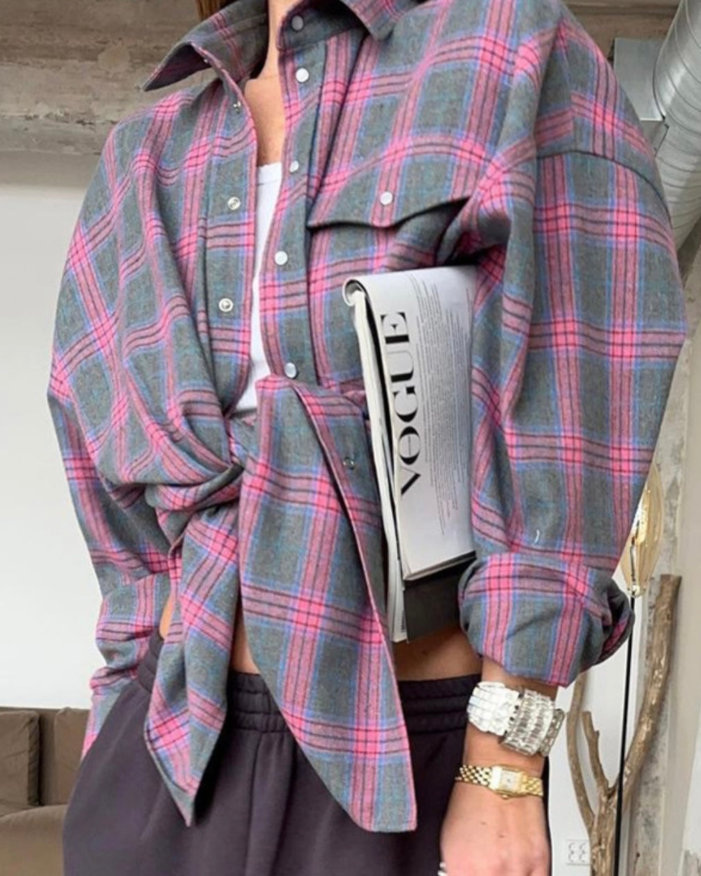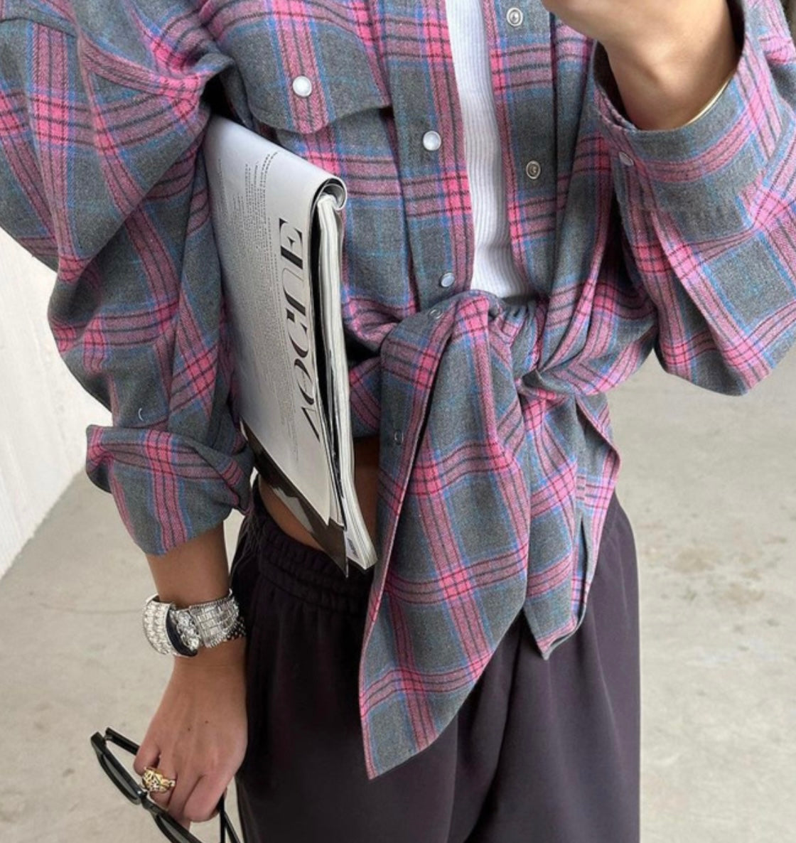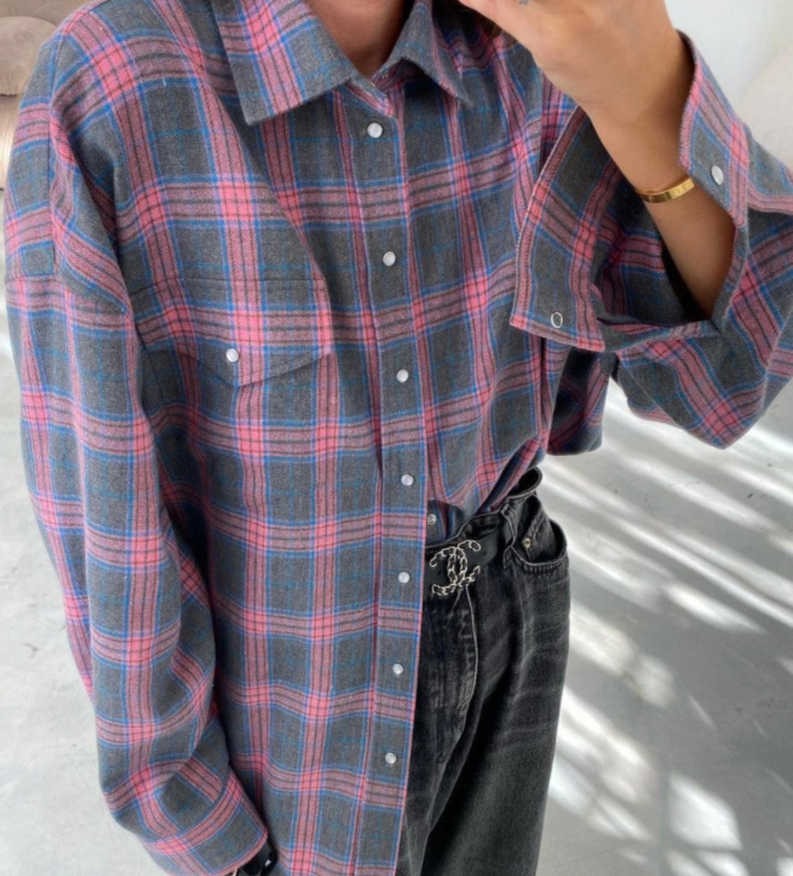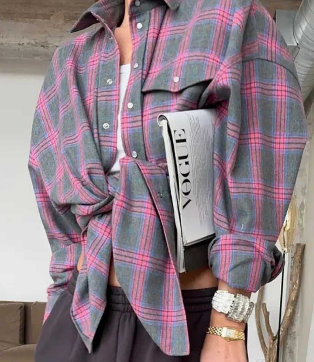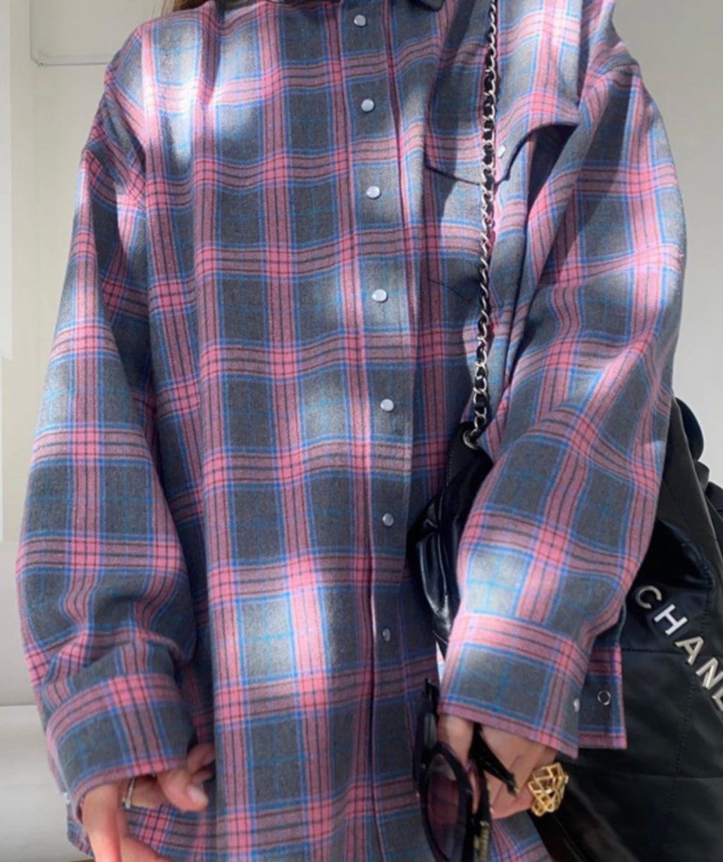 Grey & Pink Plaid Snap Shirt