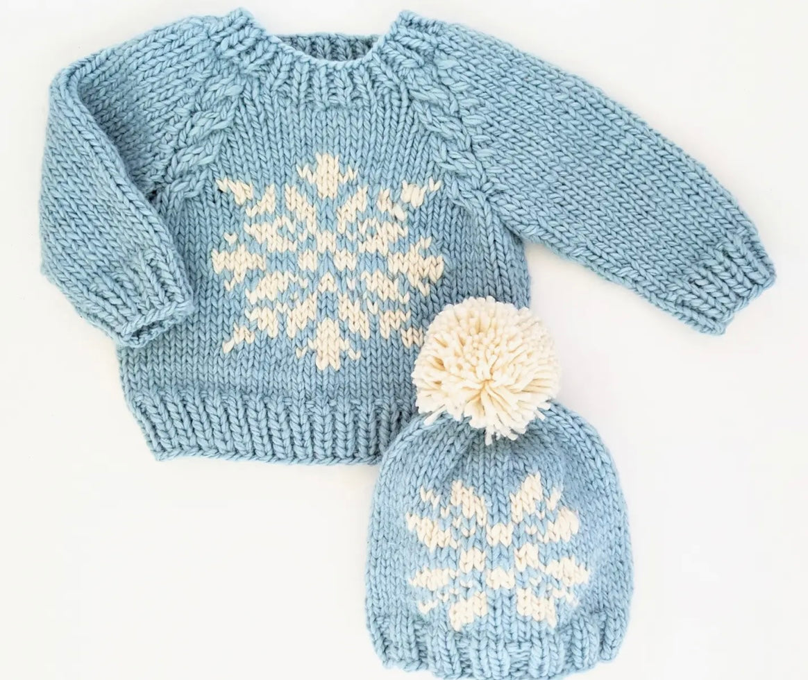Blue Snowflake Hand Knit Cardigan & Hat Set