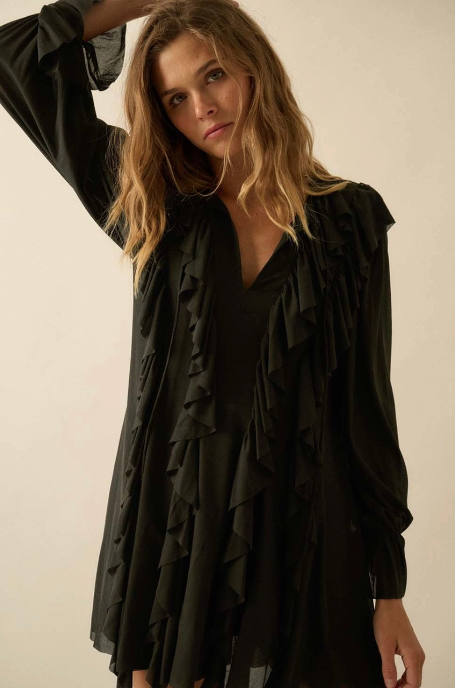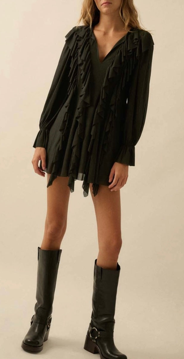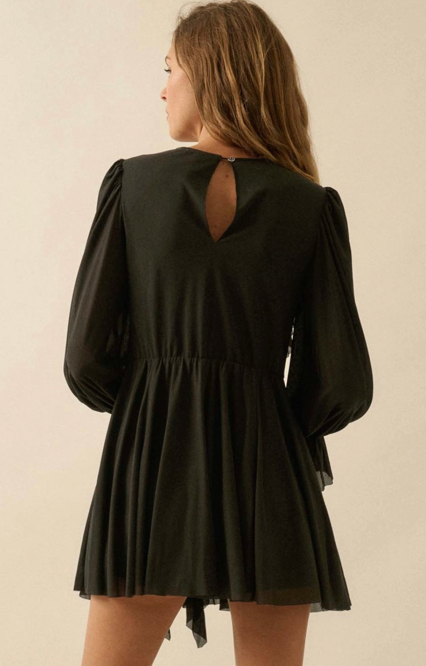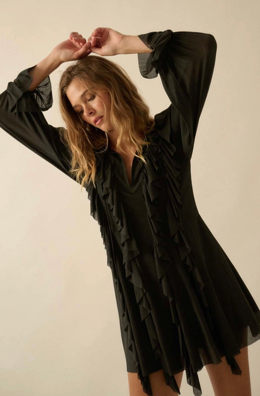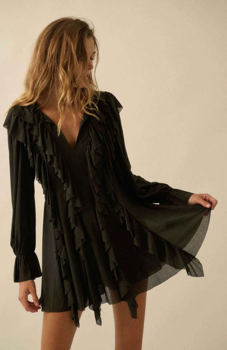 Black Cascade Ruffles Trumpet Sleeve Knit Romper