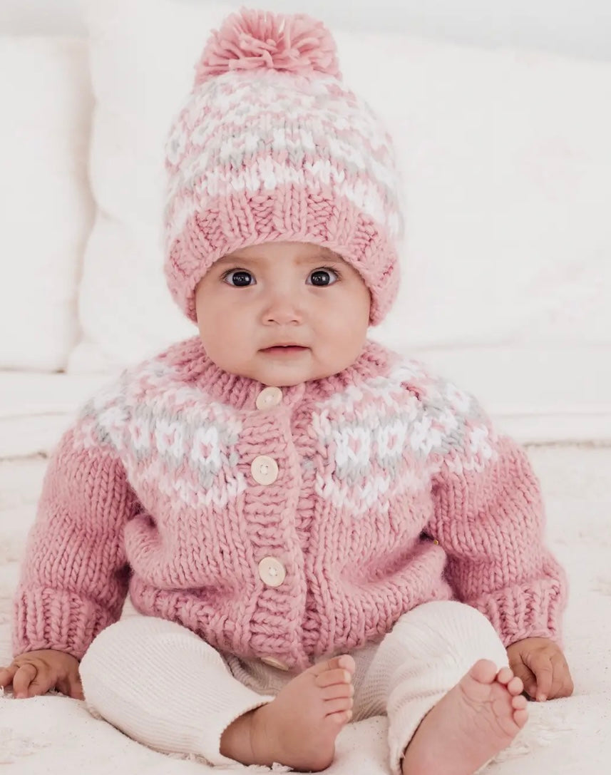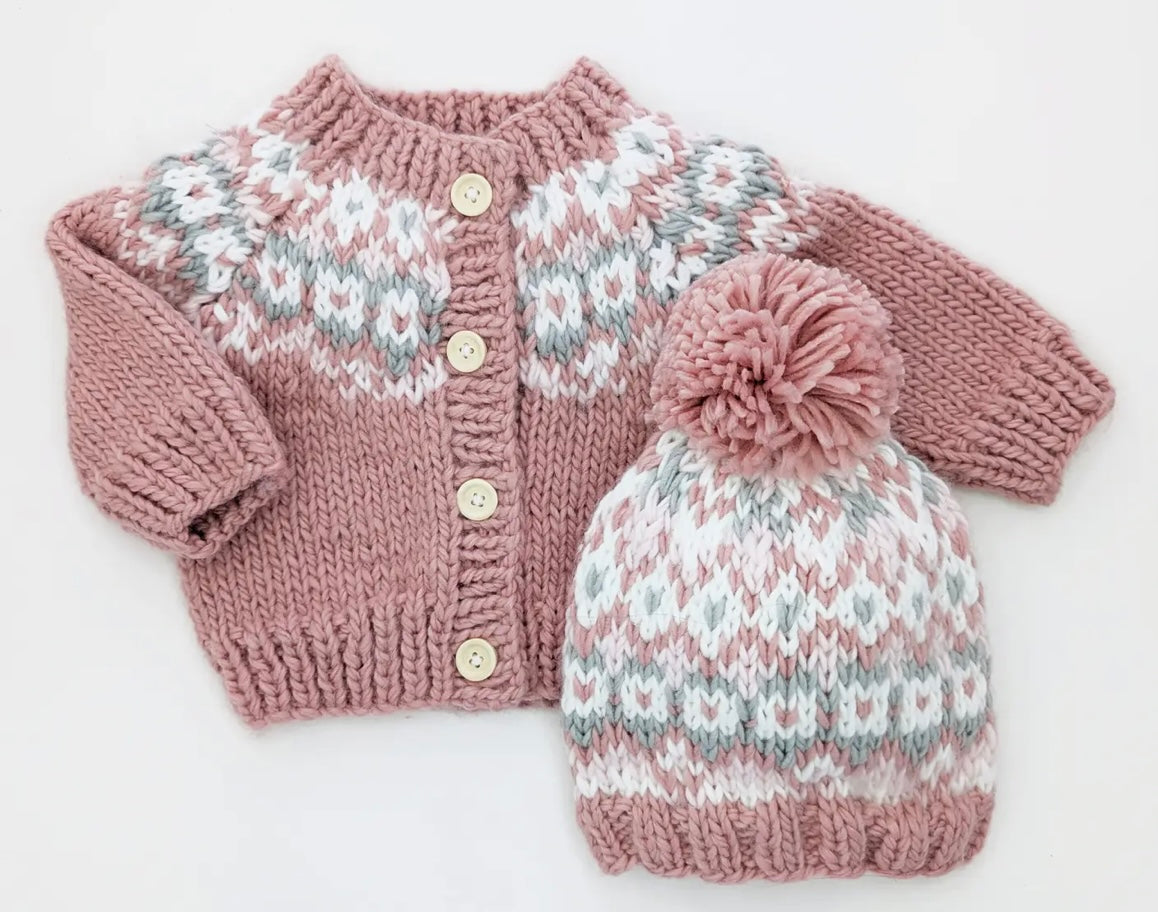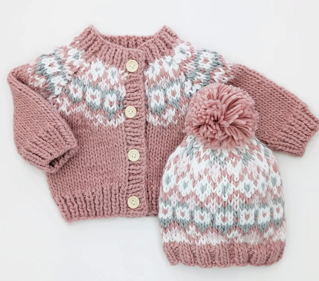 Fairisle Rosy Hand Knit Cardigan Sweater & Hat Set