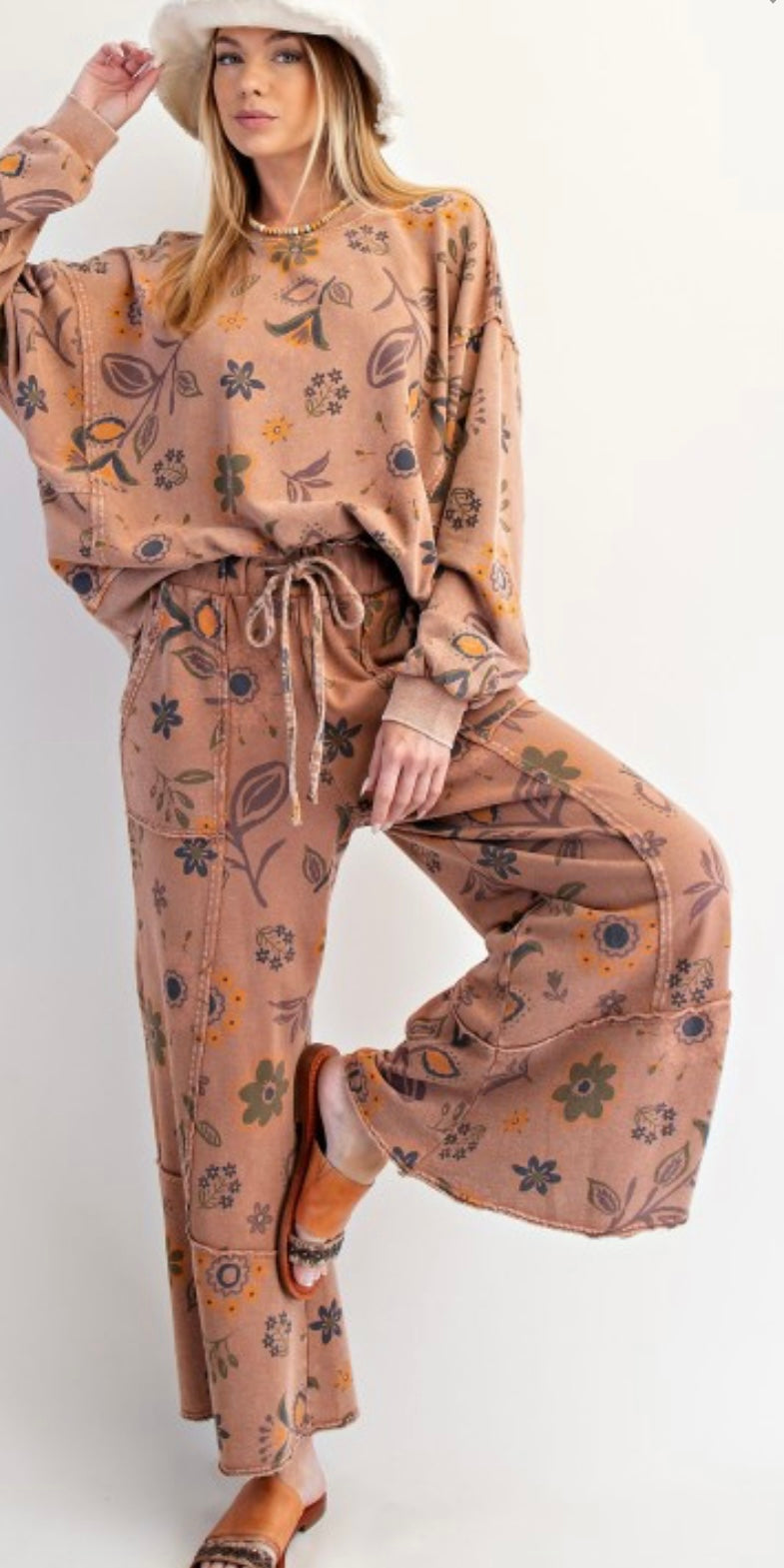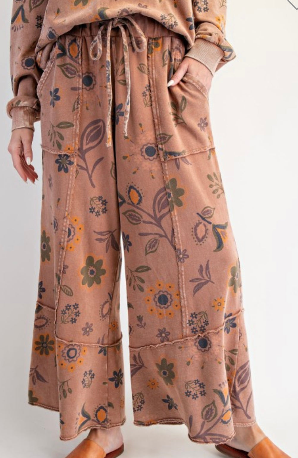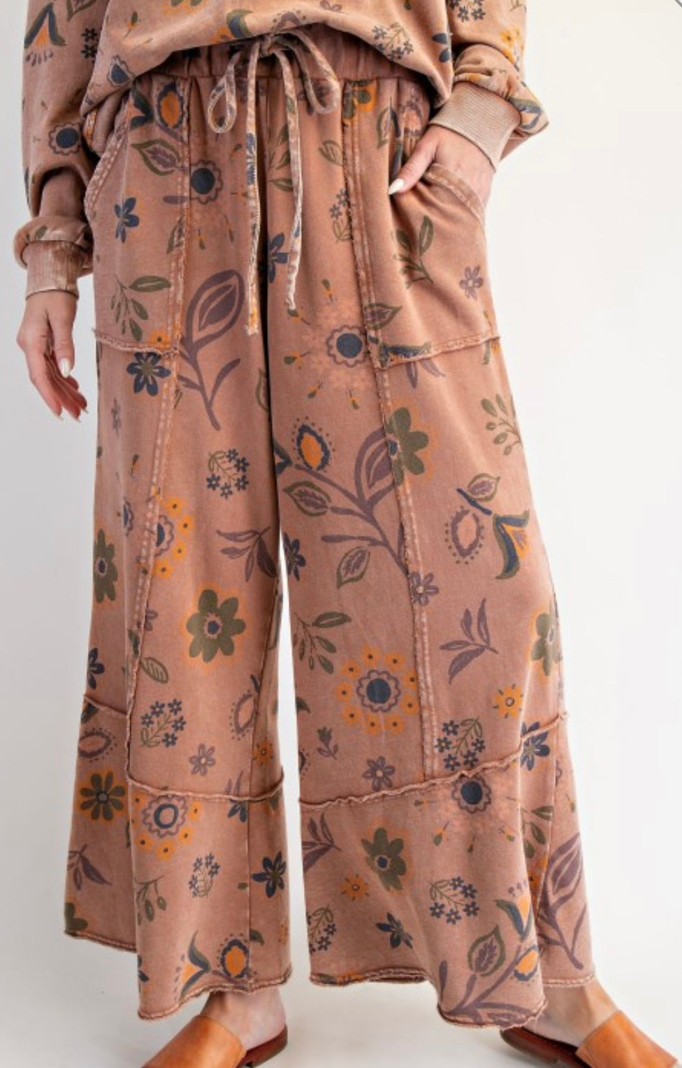 Mocha Floral Printed Washed Terry Wide Leg Pants