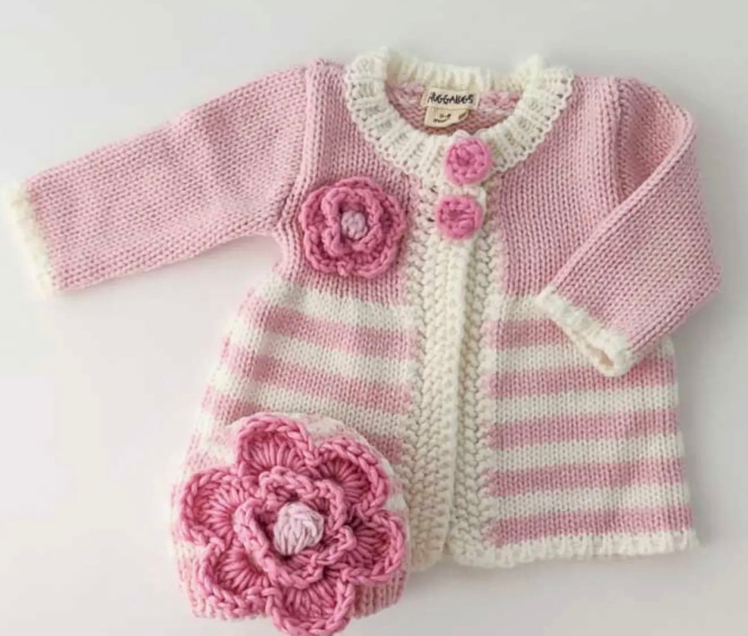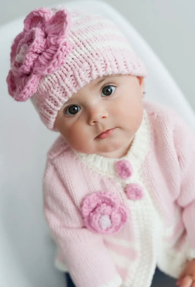 Parfait Pink Ziggy Floral Hand Knit Cardigan & Hat Set