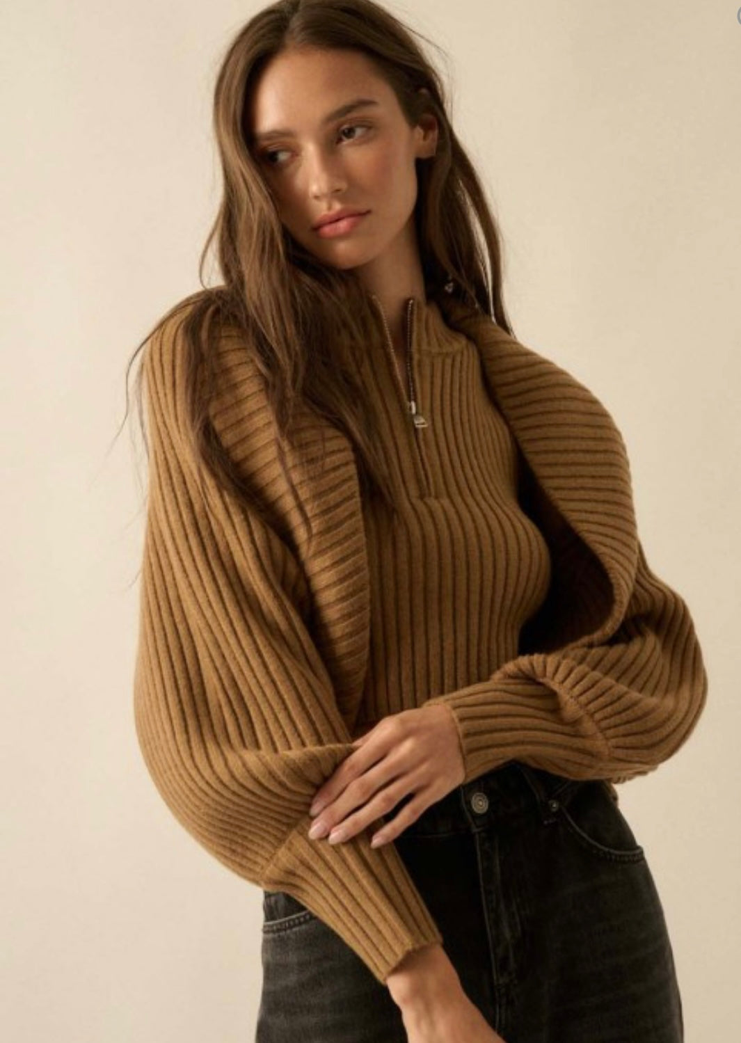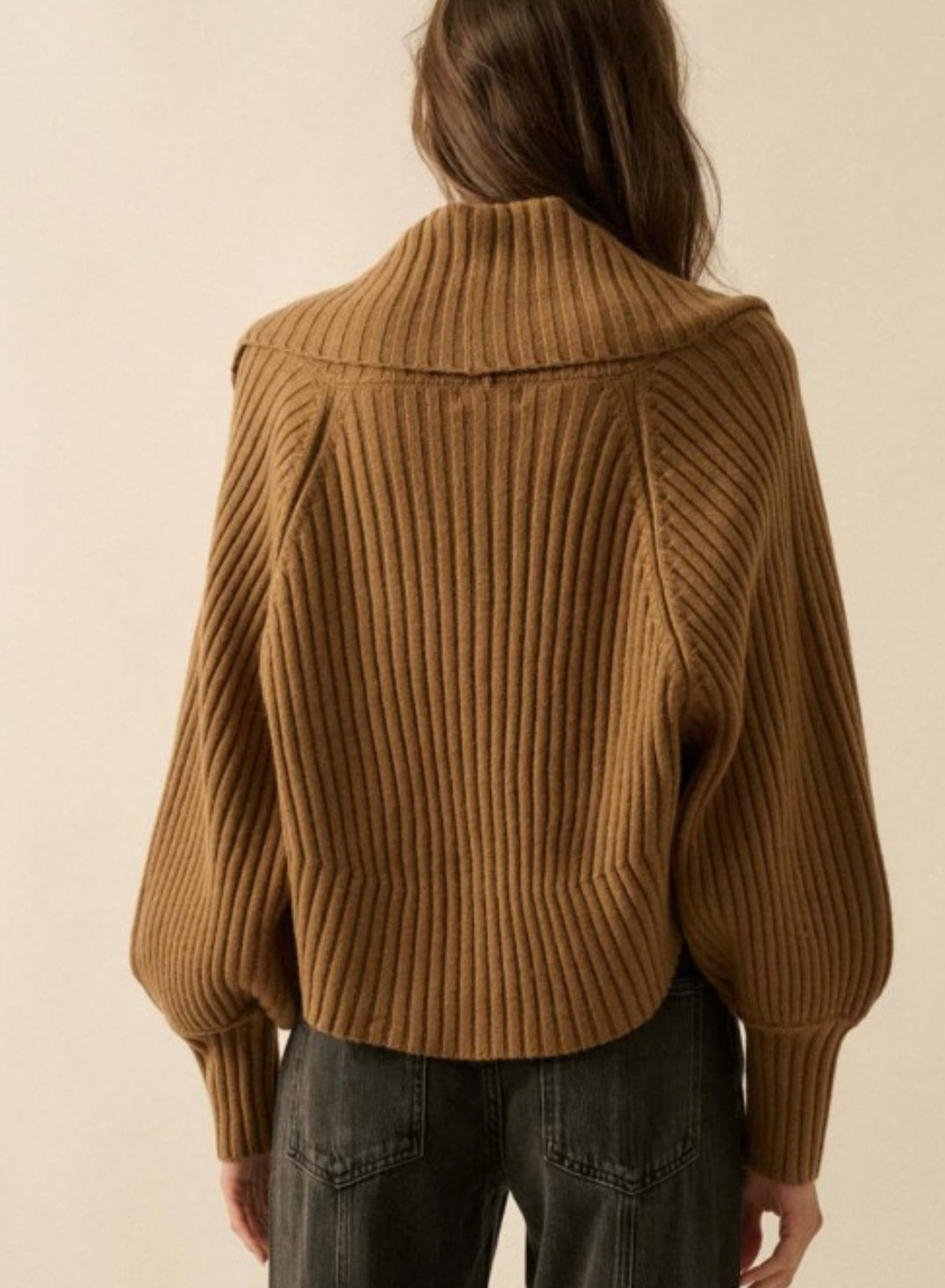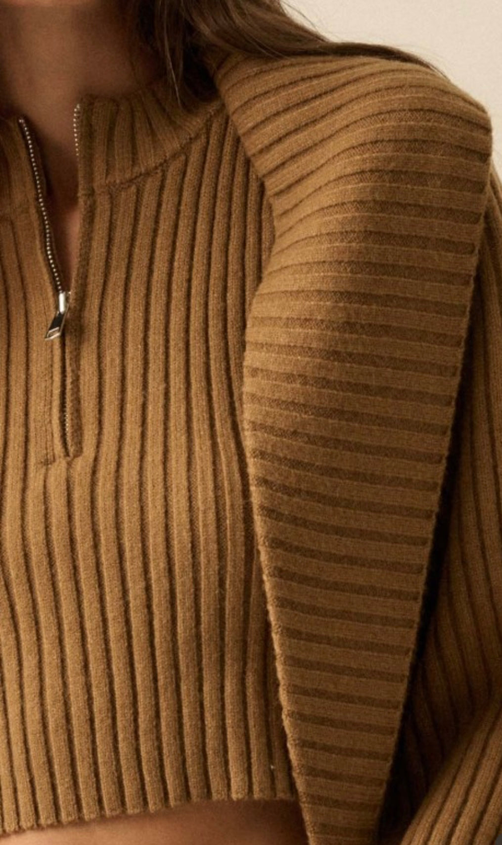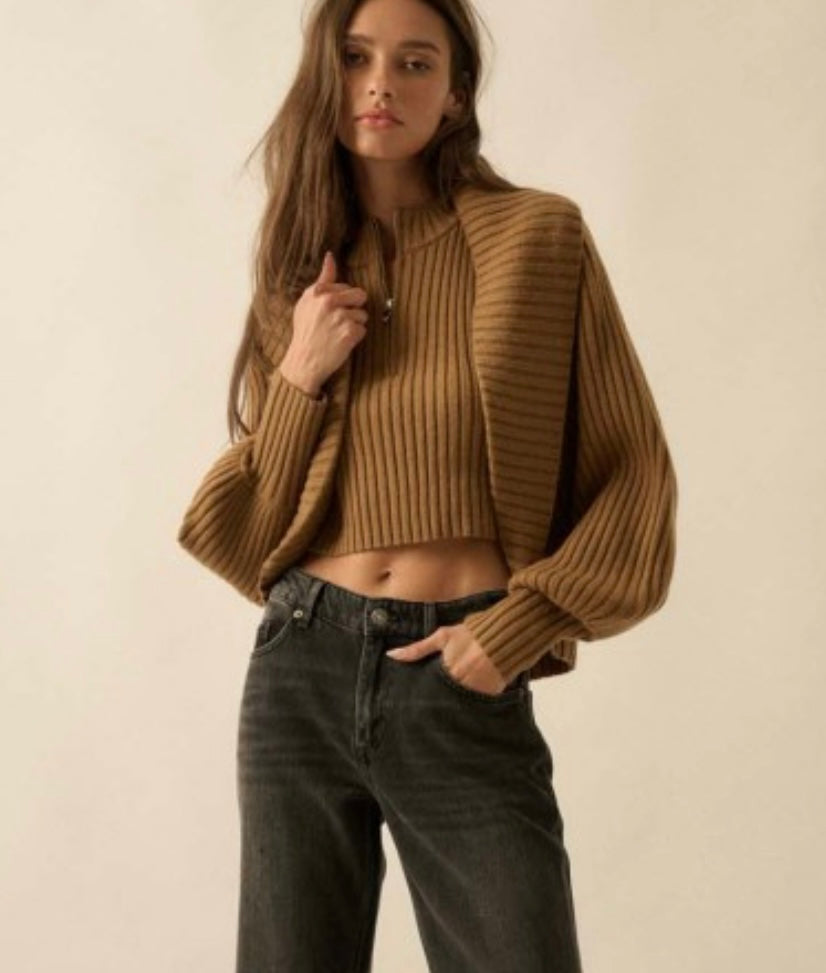 Taupe Ribbed Knit Shrug and Half Zip Tank Sweater Set