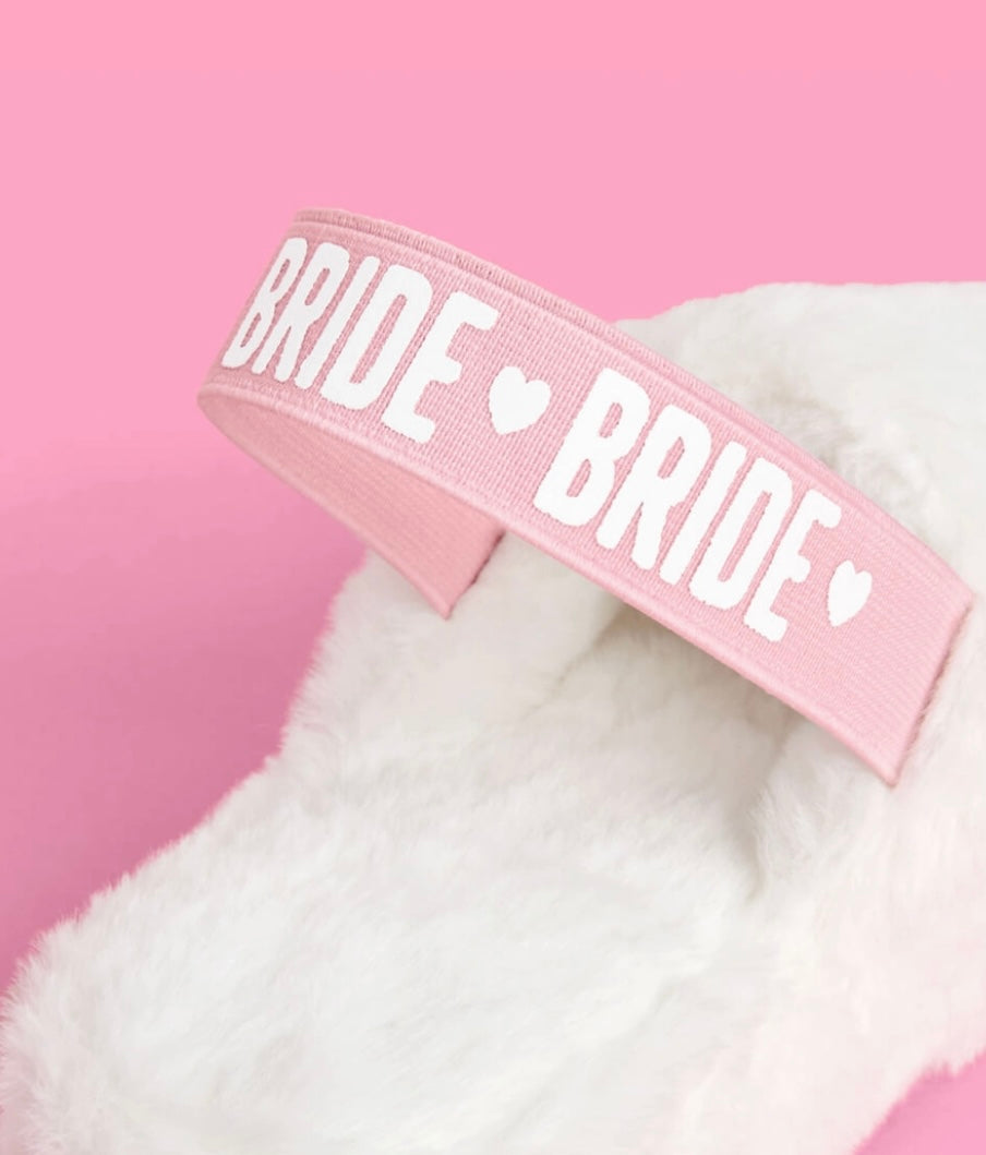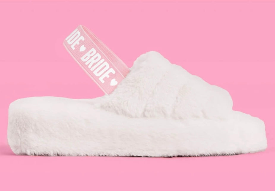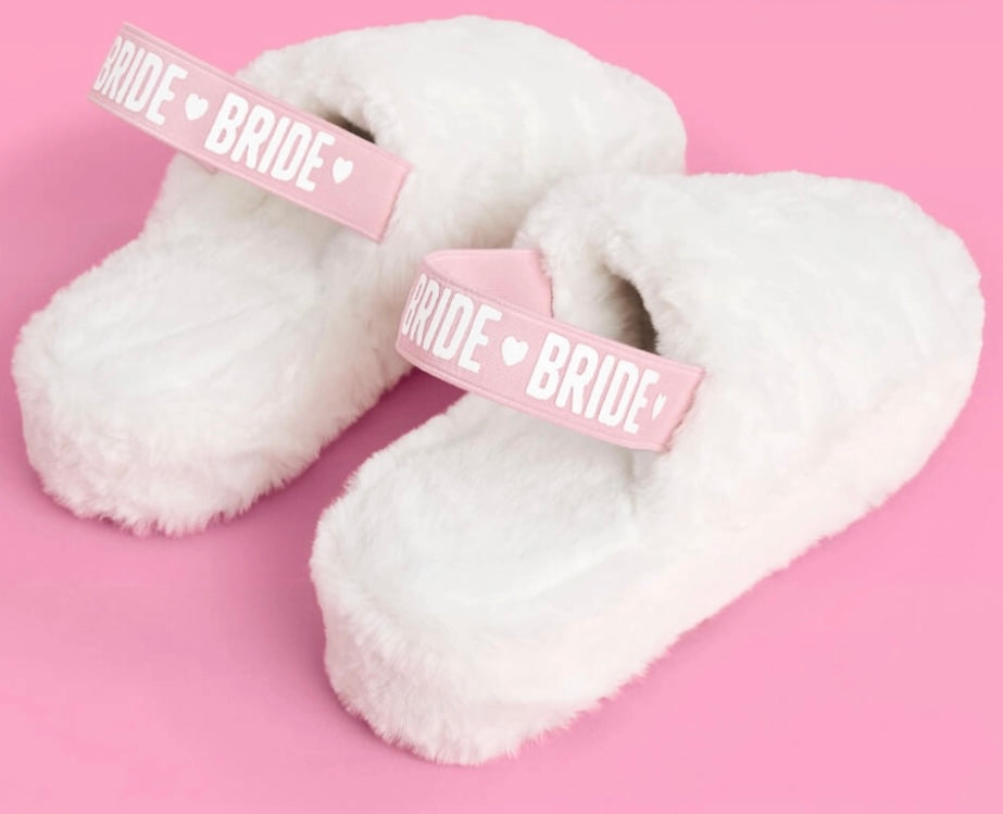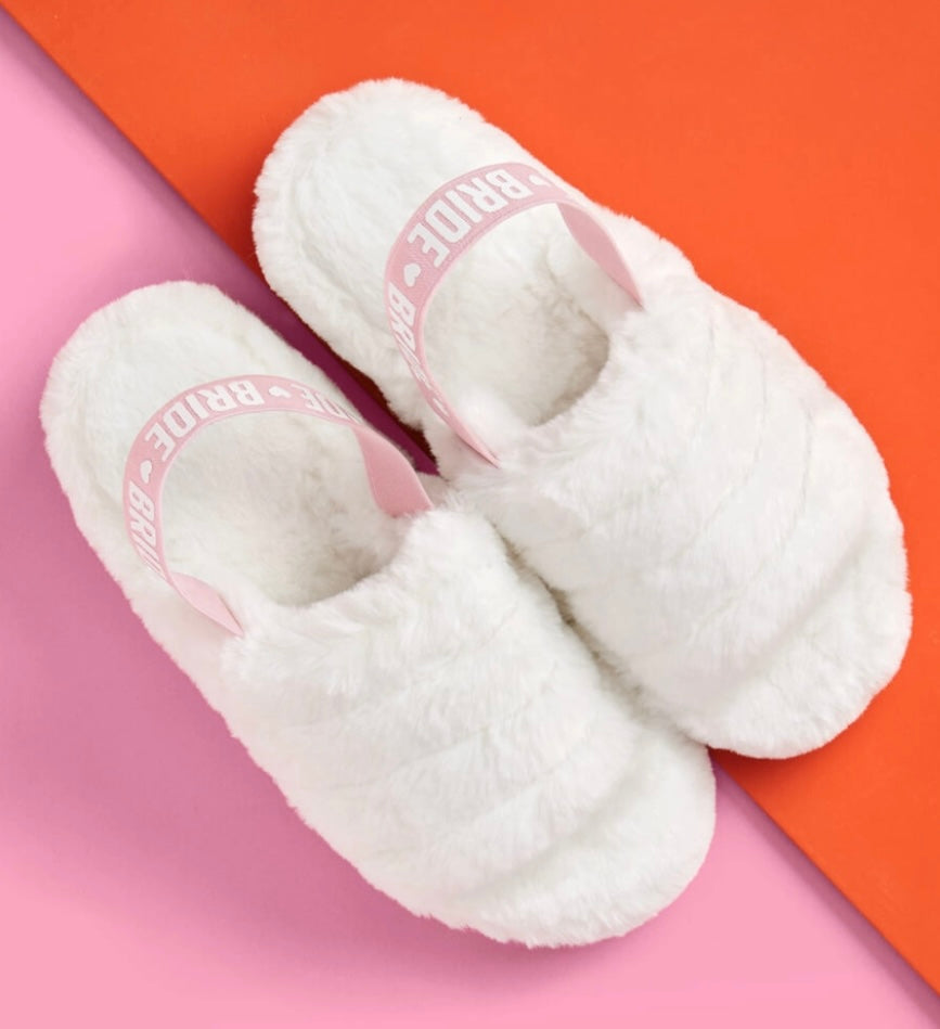 White Bride Fur Slippers with Pink Bride Lettering
